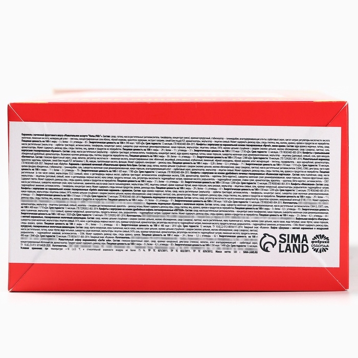 Состав: сахар, патока, масла растительные, какао-порошок алкализованный, агент желирующий – пектины, сыворотка молочная сухая, регуляторы кислотности (лимонная кислота, цитрат натрия), красители (экстракт паприки, куркумин), эмульгатор – лецитин соевый, ароматизаторы. Может содержать незначительное количество яичного белка, глютена, продуктов переработки орехов, арахиса, экстракта ячменно-солодового. Противопоказано при индивидуальной непереносимости белка молока.