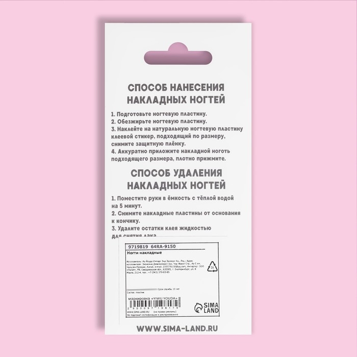Максимальный срок носки накладных ногтей – 14 дней. Не рекомендуем перенашивать. При бережном ношении могут использоваться несколько раз.