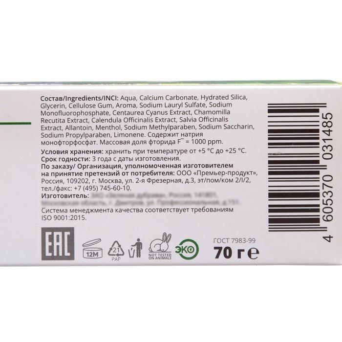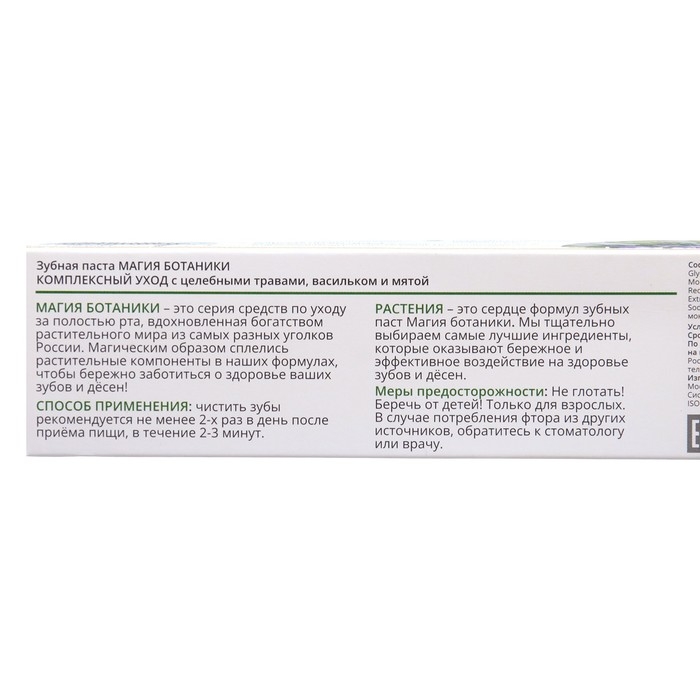 Зубная паста Комплексный уход с целебными травами от компании Магия Ботаники, изготовлена на отваре целебных трав, васильков и мяты. Отвар трав используется взамен обычной воды и получается в результате низкотемпературной экстракции (35%), что позволяет достичь максимально полного переноса ценных веществ из растений в отвар. Зубная паста бережно очищает эмаль за счет природного абразива - диоксида кремния (Silica). Диоксид кремния не царапает эмаль в процессе чистки зубов, при этом позволяет добиться равномерного удаления налета по всей поверхности зубов. Зубная паста содержит фтор на уровне 1000 ppm, что соответствует среднему уровню содержания фторидов и подходит для ежедневной защиты эмали от деминерализации.