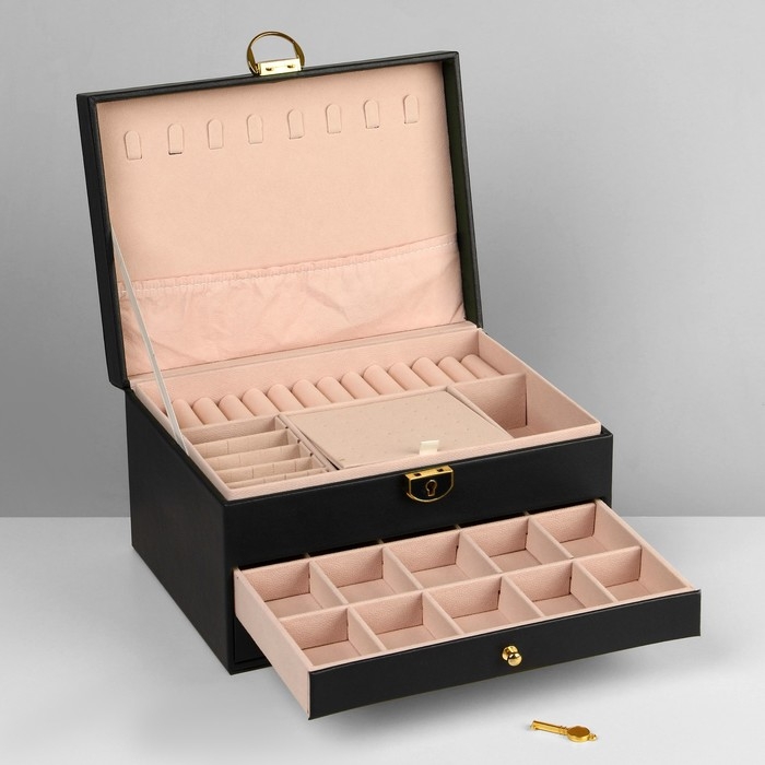 Шкатулка для украшений — удобный и стильный органайзер для хранения и демонстрации любимых аксессуаров, идеально подходящий для использования дома и в путешествиях. Благодаря продуманной внутренней организации, шкатулка позволяет разместить кольца, серьги, браслеты и цепочки, сохраняя их в порядке и защищая от повреждений. Компактный размер и практичные отделения делают шкатулку отличным выбором для тех, кто ценит порядок и удобство. Это идеальный аксессуар, который сохранит ваши украшения в идеальном состоянии и придаст вашему пространству стильный акцент.