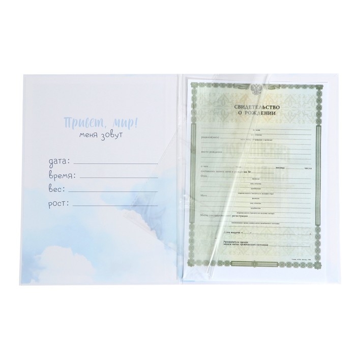 Папка под свидетельство о рождении формата А4 имеет удобный файл внутри, который защитит первый в жизни документ малыша от повреждений.