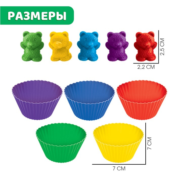 Попросите кроху посчитать количество мишек каждого цвета и разложить их по соответствующим формочкам.