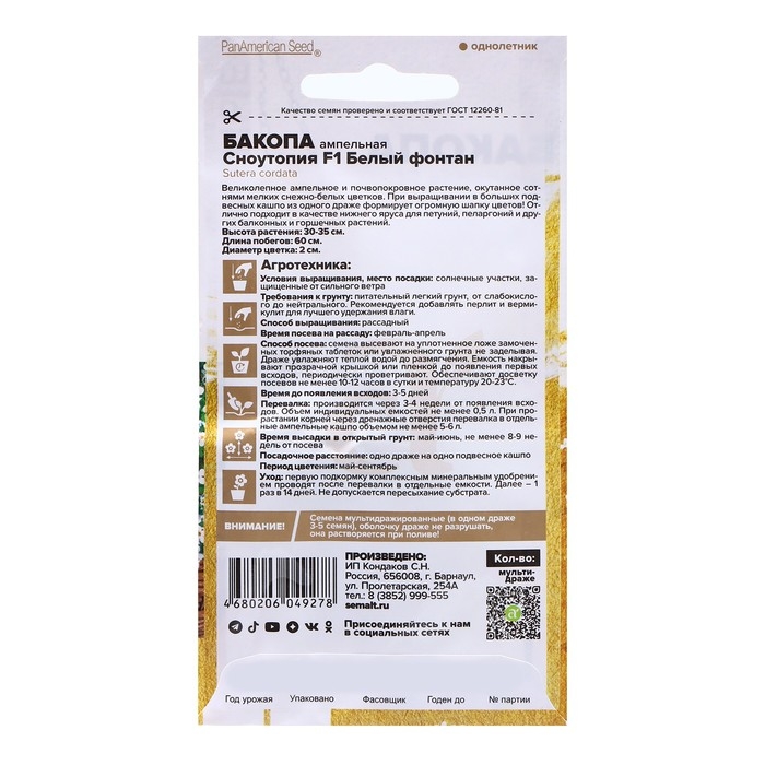 Бакопа Сноутопия F1 в летний период сплошь покрывается белыми небольшими цветочками, диаметром до 1,5 см. Длина её побегов может достигать до 60 см. Если побеги соприкасаются с землёй – они пускают корни. Хотя в идеале мы рекомендуем всё-таки прищипывать главный побег, чтобы длина растения была, пусть и не такой длинной, зато сформируется пышный габитус. Бакопа во многом похожа на петунию. Сорт Сноутопия F1 имеет очень мелкие семена, для прорастания которых требуется свет. Поэтому семена высаживают поверхностно и ставят на солнечное место. В идеале температура должна быть около +22°С. Первые ростки появляются через неделю – две. Далее на стадии 3-х настоящих листочков бакопу стоит пикировать, при этом пикировку лучше провести 2 раза. После 2-й пикировки начните закалять рассаду, вынося её на полчаса на балкон. Постепенно понижайте температуру до +17°С в дневные часы. После весенних заморозков можете пересадить бакопу в уличное подвесное кашпо или вазоны. Растение можно посадить и в открытый грунт, тогда оно сформирует плотный ковер с белоснежными цветами! Местоположение ей лучше выбирать солнечное. После укоренения в грунте бакопа не боится даже заморозков до -5°С