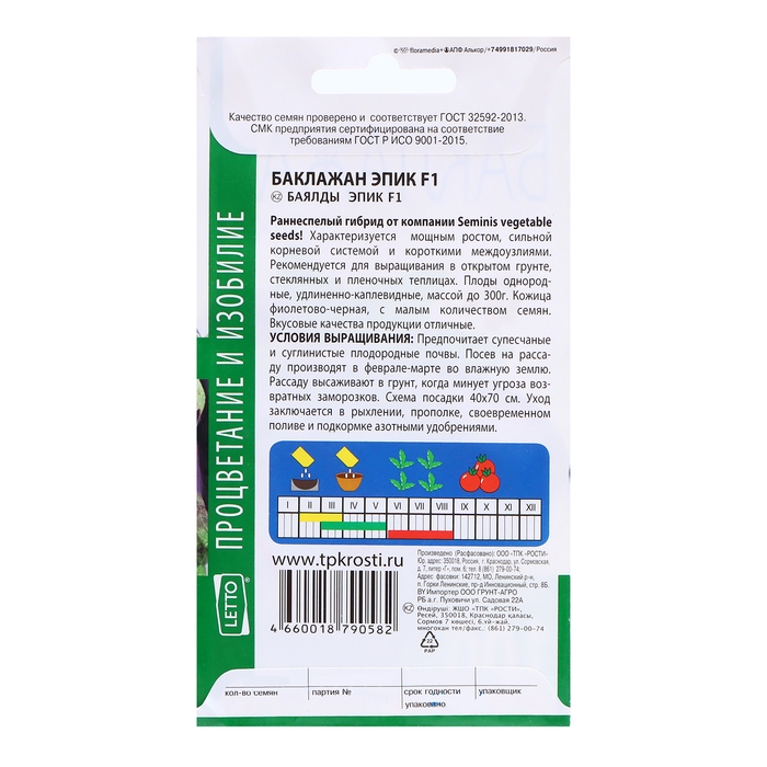 Гибрид скороспелый, стрессоустойчивый. От всходов до первого сбора — 105-110 дней. Растение мощное, с прекрасной силой роста, прямостоячее, высотой до 90 см. Плоды цилиндрической формы, очень привлекательного пурпурно-чёрного цвета, с красивой контрастной зеленой плодоножкой. Шипы на чашечке редкие. Мякоть плотная, белого цвета, массой 200-250 г. Устойчив к вирусу табачной мозаики (TMV). Подходит для выращивания как в открытом, так и в защищенном грунте. Плотность посадки — 4-5 растения/м2. Урожайность в открытом грунте — около 5,0 кг/м2, в защищенном — свыше 7,0 кг/м2.
