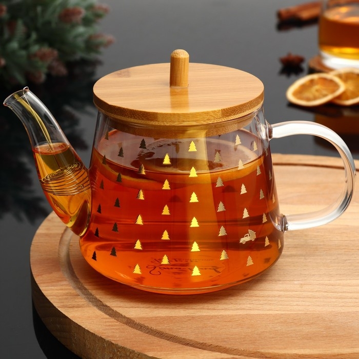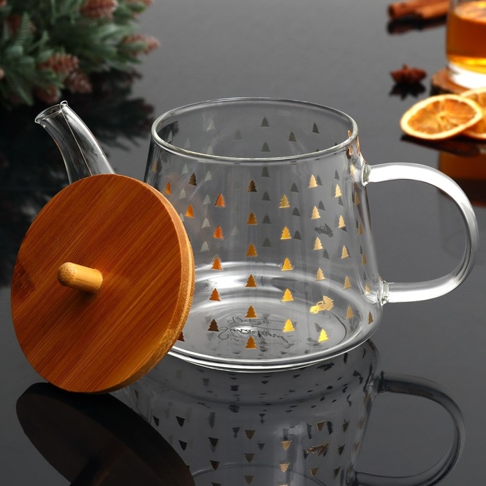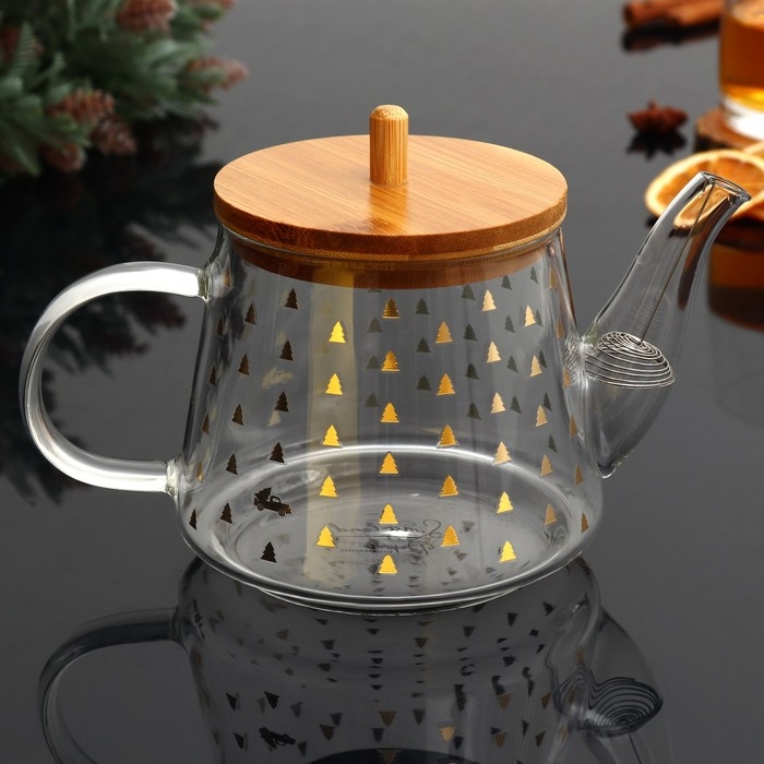 Новогодний стеклянный заварочный чайник с бамбуковой крышкой и объёмом 600 мл — это стильный и функциональный аксессуар для вашей кухни.