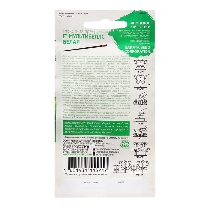 Семена Глоксиния "Мультибеллс белая", ц/п, F1 4 шт.