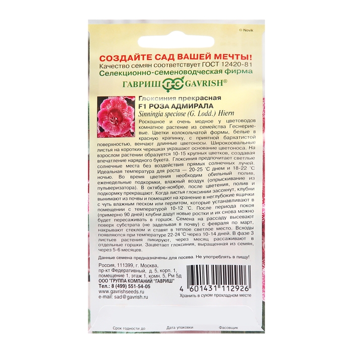 Семена Глоксиния прекрасная "Роза адмирала", ц/п, F1, 4 шт