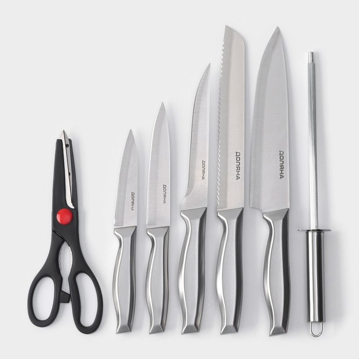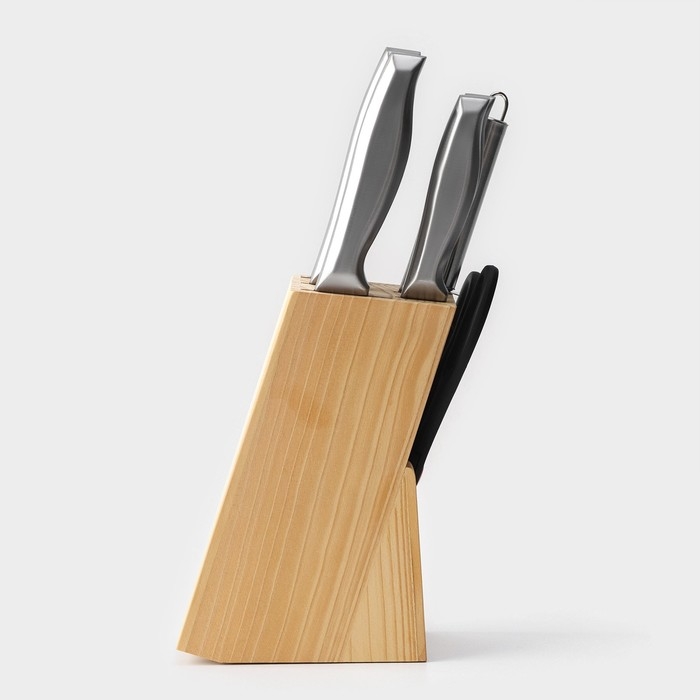 Набор ножей кухонных на подставке Доляна «Металлик», 7 предметов: 5 ножей, мусат и ножницы, цвет серебристый