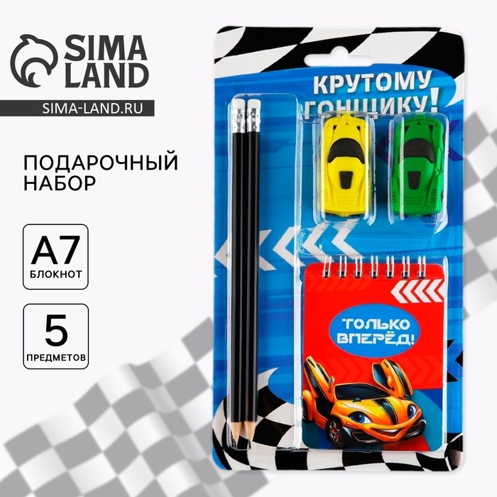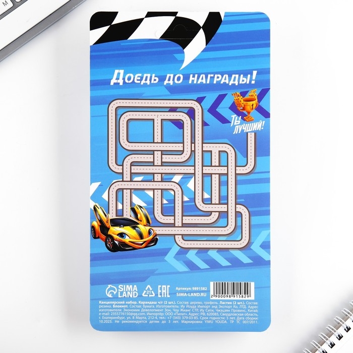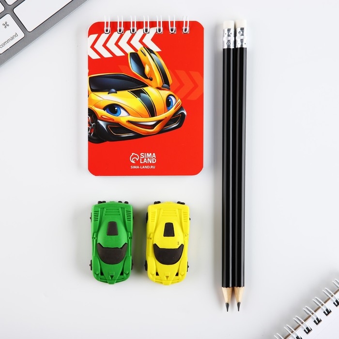 Канцелярский набор «Крутому гонщику», карандаши 2 шт, ластики 2 шт, блокнот