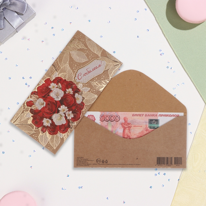 Конверт для денег "С Юбилеем!" крафт, тиснение, букет, 17х8 см