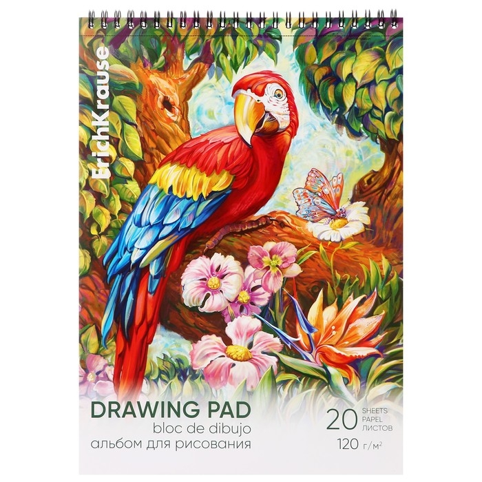 Альбом для рисования А4, 20 листов, блок 120 г/м², на спирали, Erich Krause "Попугай", 100% белизна, перфорация на отрыв, твердая подложка
