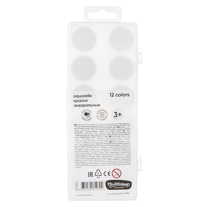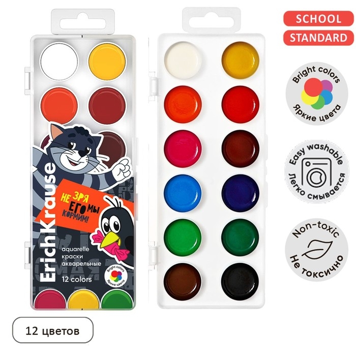 Акварель 12 цветов, ErichKrause "Простоквашино", без кисти, пластиковая коробка, европодвес