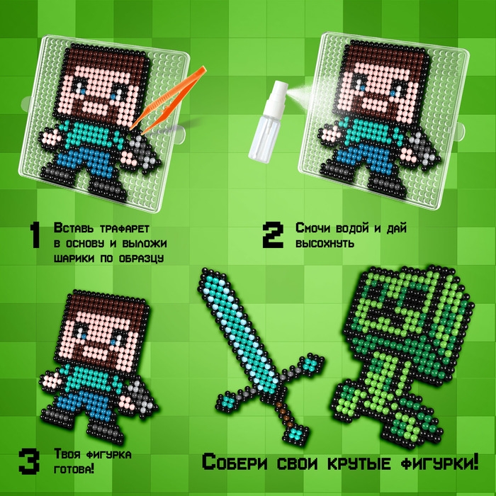 Аквамозаика «Кубамир» — это набор для творчества, с которым можно сделать красочные объёмные фигурки. Юные любители известной игры порадуются возможности собрать любимых персонажей из бисера. Яркие картинки подойдут в качестве подарка или для украшения комнаты.