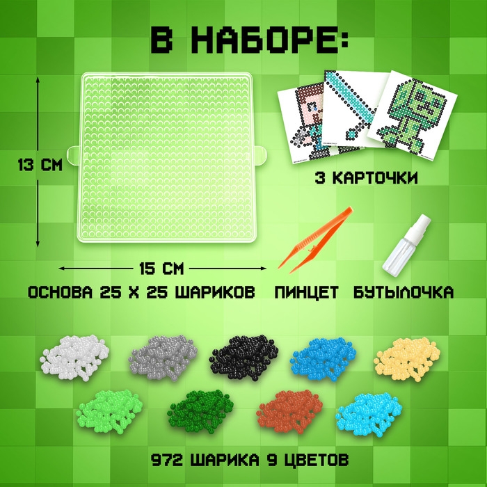 Изображения создаются с помощью специальных бусин девяти цветов. В наборе 972 шарика, поэтому их хватит на 3 фигурки. Бисер скрепляется простой водой и прочно держит форму после высыхания.