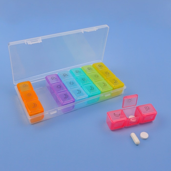 Теперь Вы не забудете принять витамины или таблетки в течение дня: удобная и функциональная таблетница поможет распределить приём нужных препаратов по дням недели и вовремя вспомнить о них.