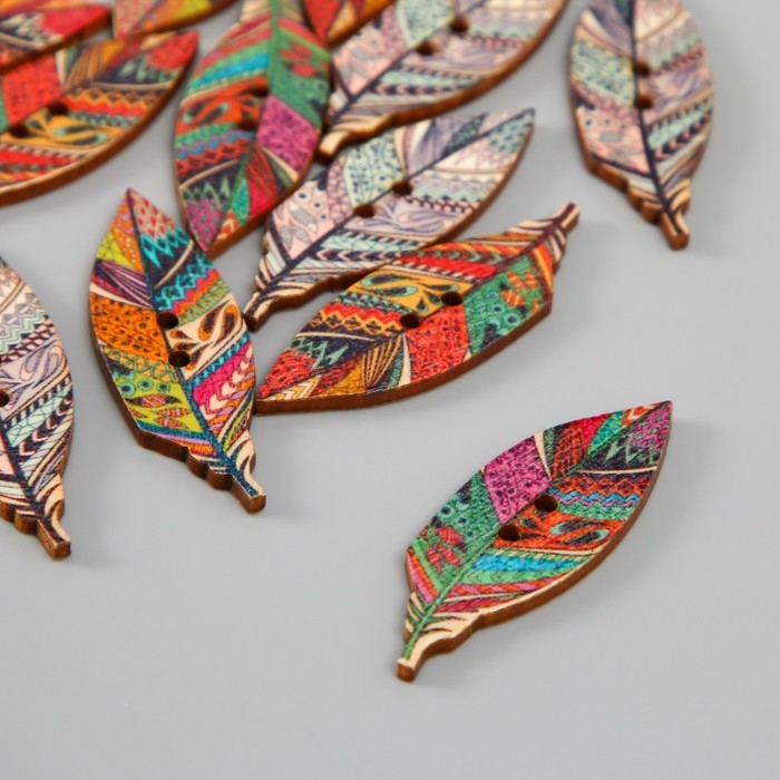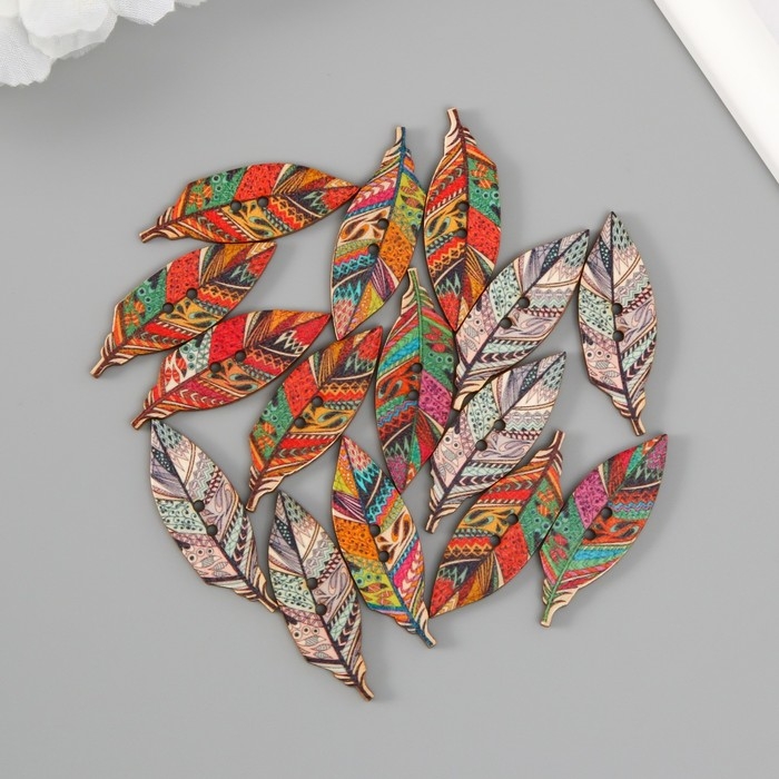 Пуговица дерево для творчества 2 прокола "Пёрышки с узорами" набор 16 шт МИКС 4,2х1,4х0,2 см