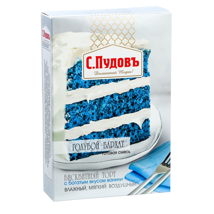 «Голубой бархат» - изысканный торт яркого цвета с невероятно вкусными воздушными бисквитами. Приготовить его максимально быстро и легко вы сможете из готовой смеси «С.Пудовъ».