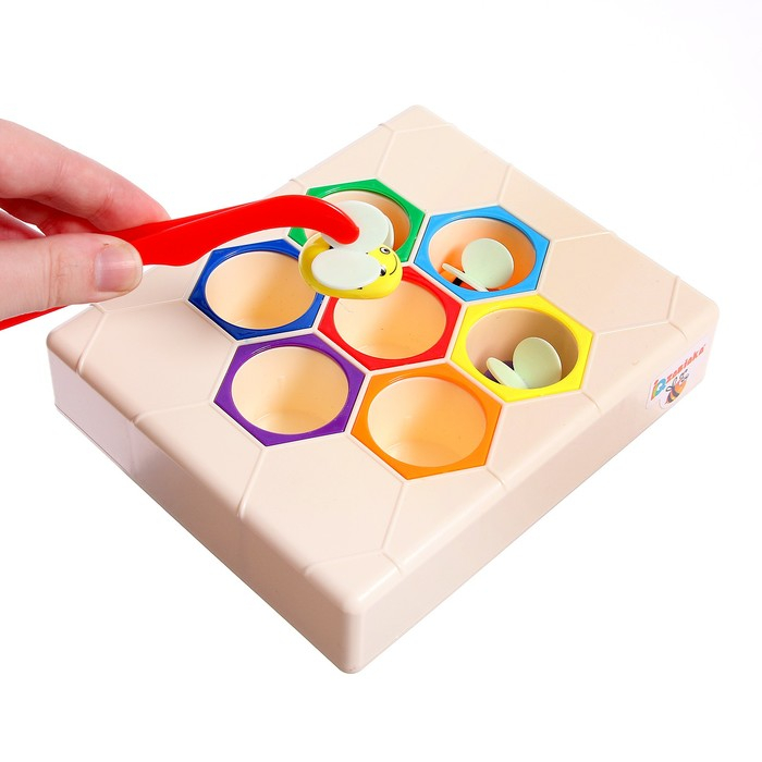 Игра создана для тренировки мелкой моторики, обучению цветам и счёту. Малыш будет раскладывать пчёлок по своим домикам, ориентируясь на их цвет. Процесс можно усложнять, добавляя задания с карточек и пинцет.