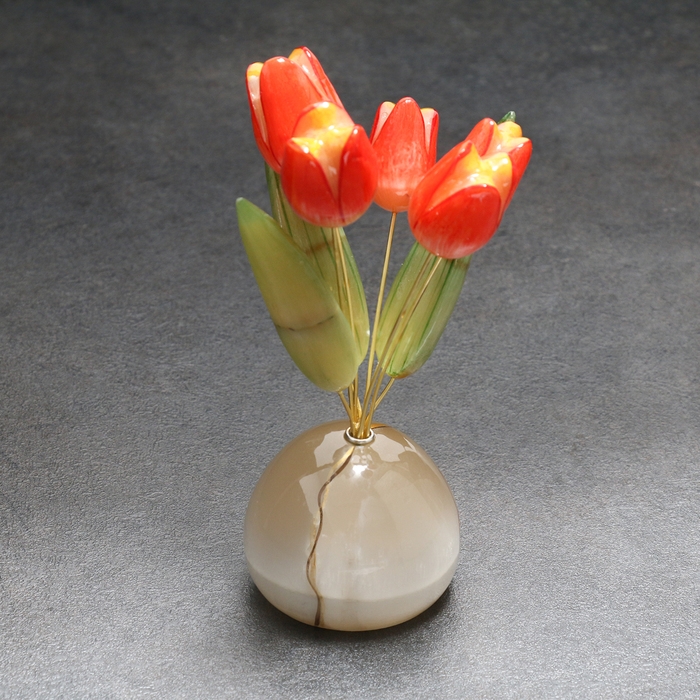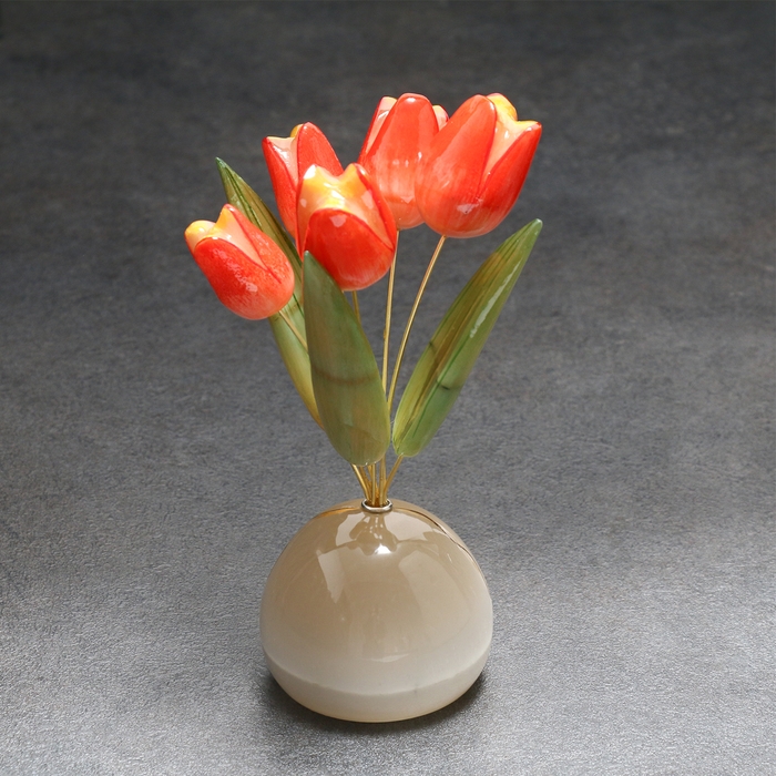 Сувенир "Тюльпаны в вазе" (5 цв.) круглая, селенит, малая (красные)