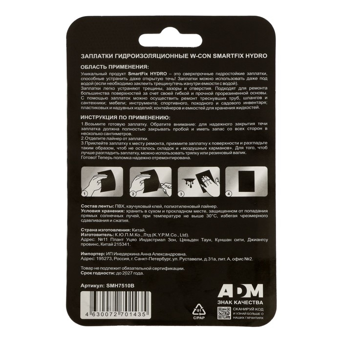 Заплатки гидроизоляционные W-con SmartFix HYDRO, 7.5 х 10 см, черные, 2 шт
