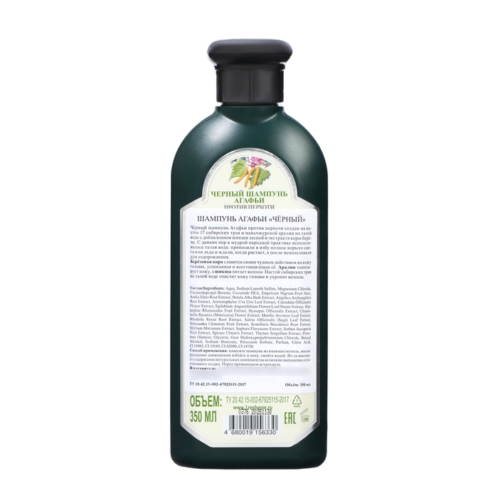 Черный шампунь Агафьи против перхоти создан на настое 17 сибирских трав и сухого чернокорня на талой воде с добавлением ягоды шикши лесной и березового дегтя. Березовый деготь славится своим чудным действием на кожу головы, предотвращая появление перхоти. Чернокорень улучшает кровообращение, а шикша питает волосы. Настой трав сибирских на талой воде успокоит кожу головы, избавит от перхоти и укрепит волосы.