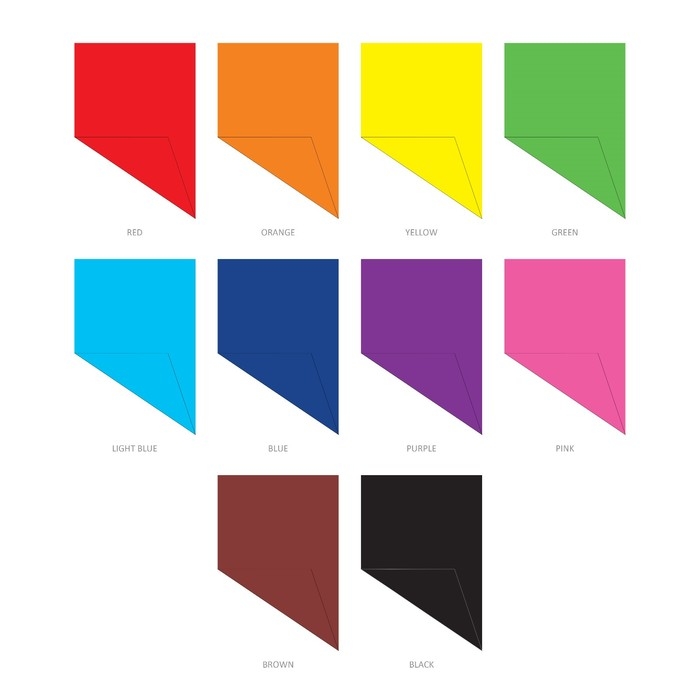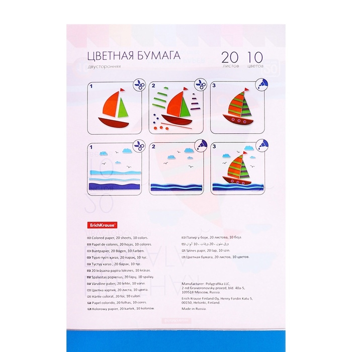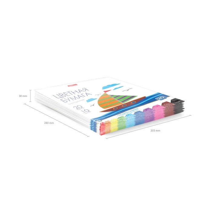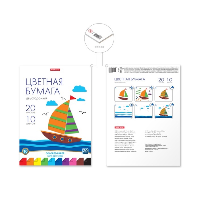 Цветная бумага немелованная двусторонняя формата А4 (203х280 мм). Яркие насыщенные цвета. 20 листов, 10 цветов. Плотность наполнения — 80 г/м2. Тип скрепления — клей. На внутренней стороне обложки приводятся инструкции по изготовлению поделок. Упакована в термоусадочную пленку по 10 штук
