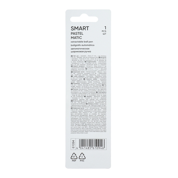 Классическая автоматическая шариковая ручка с металлическим клипом, стандартным типом пишущего узла и заменяемым стержнем. Ручка имеет непрозрачный глянцевый круглый корпус нежных пастельных цветов. 5-канальный пишущий узел с диаметром шарика 0.7 мм в сочетании с быстросохнущими чернилами обеспечивает мягкое и быстрое письмо. Длина непрерывной линии составляет 1000 м при толщине 0.35 мм, что является высоким показателем в своей категории. Ручка Smart® имеет строгую, классическую форму и рекомендована в качестве надежной ручки для повседневного использования.
