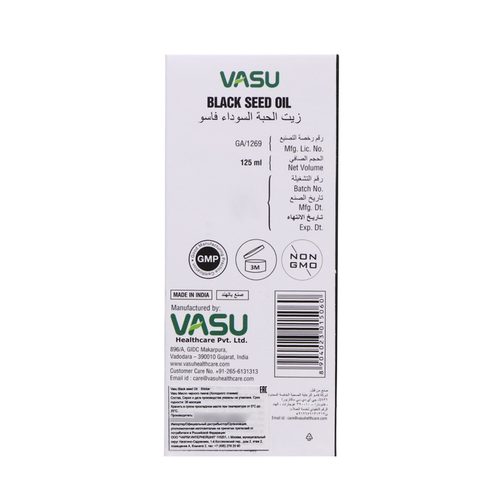 Масло чёрного тмина Васу, холодного отжима, 125 мл - это высококачественный продукт, который производится из отборных семян чёрного тмина. Это масло обладает уникальными свойствами и широко используется в косметологии и медицине.