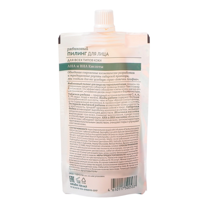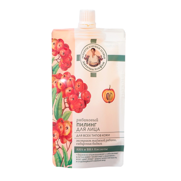 Рябиновый пилинг для лица. Объединив современные косметические разработки и традиционные рецепты сибирской травницы, мы создали для вас целебную серию ?Аптечка Агафьи?. Рябиновый пилинг для лица на термальной воде создан по старинным рецептам сибирской травницы Агафьи Тихоновны Ермаковой. Он эффективно обновляет клетки кожи, мягко отшелушивает, мгновенно делая лицо гладким и бархатистым. Таёжная рябина ? природный источник витаминов С, А, К, Е, РР, меди, йода и железа. Ягоды рябины содержат больше аскорбиновой кислоты, чем ягоды чёрной смородины, а по содержанию витамина А превосходят даже морковь. Экстракт таёжной рябины возвращает коже упругость и эластичность, придаёт здоровое сияние и тонус. Сибирская бадяга активизирует выработку коллагена в клетках, оказывает мощное омолаживающее действие. Яблочная кислота выравнивает тон кожи, снимает воспаления, сужает поры и способствует регенерации. AHA и BHA кислоты обновляют клетки кожи, обладают антисептическим, антиоксидантным, противовоспалительным свойством, очищают поры и улучшают состояние кожи.