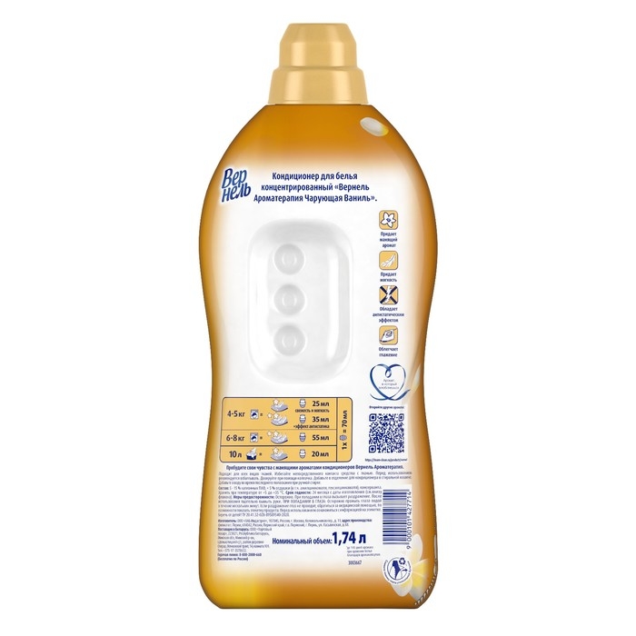 Концентрированный кондиционер для белья Вернель Ароматерапия Чарующая ваниль подарит Вашему белью не только невероятную мягкость, но и магический аромат сладких цветков ванили, а благодаря специальным аромакапсулам в составе кондиционер для стирки Вернель позволит наслаждаться интенсивным ароматом белья до 140 дней.