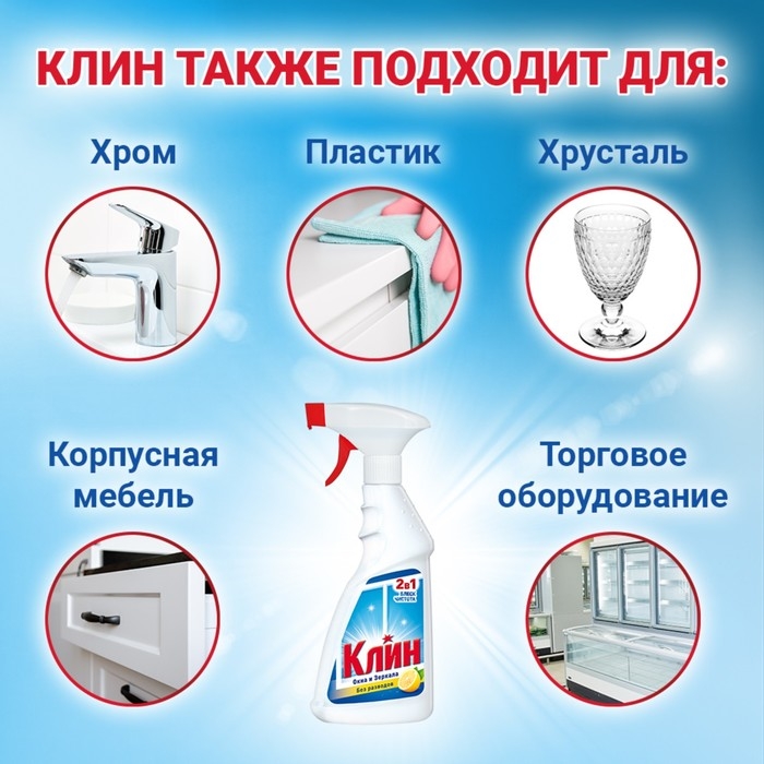 Клин 2в1 обеспечивает блеск и чистоту Ваших окон и зеркальных поверхностей.