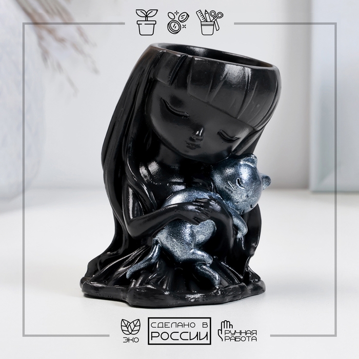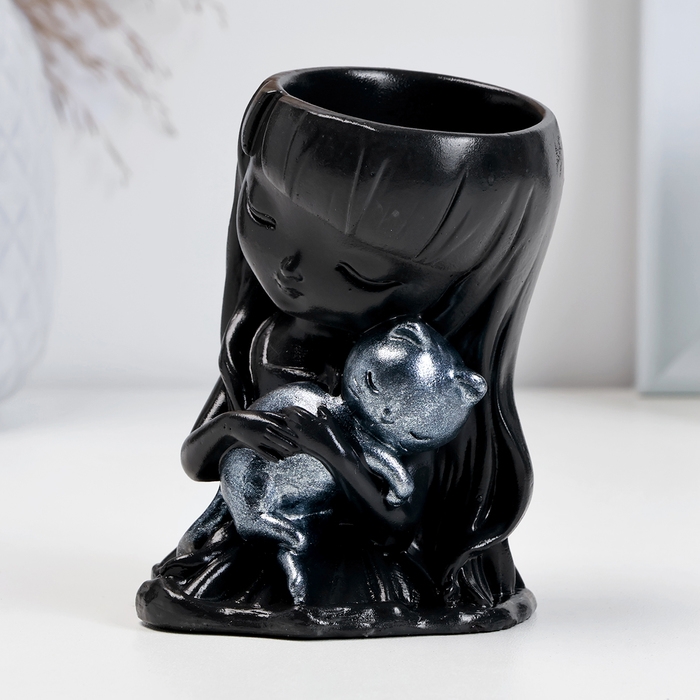 Кашпо фигурное "Девочка с котом" черное-серебро, 10см