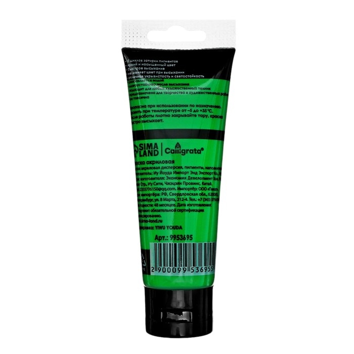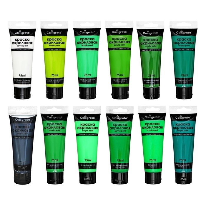 Краски акриловые 12 цветов, в тубе 75 мл, матовые, CALLIGRATA, Зеленые оттенки
