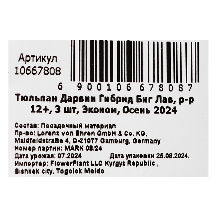 Тюльпан Дарвин Гибрид Биг Лав, р-р 12+, 3 шт, Эконом, Осень 2024