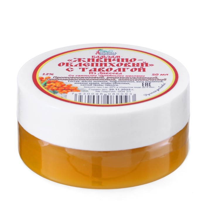 Состав: масла: подсолнечное, оливковое, льняное, воск пчелиный, ягоды облепихи, сухой экстракт травы таволги.