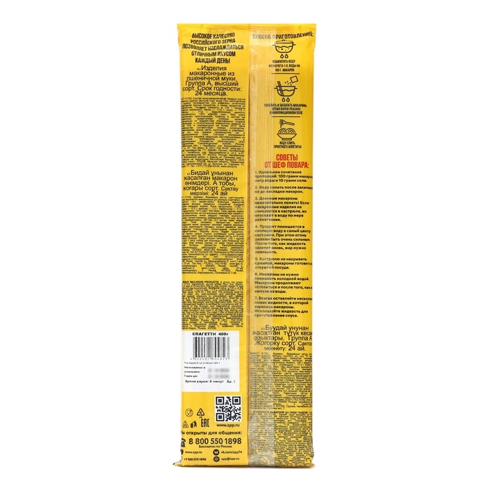 С легкостью готовятся — достаточно всего лишь несколько минут варки, и вы получите идеальные спагетти с аль денте. Удобная упаковка 400 г позволит вам приготовить как порцию для одной семьи, так и угощение для друзей на празднике.