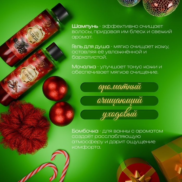 - Гель для душа "Хвоя", 100 мл — его нежная текстура мягко очищает кожу, создавая приятные ощущения свежести и комфорта. Ароматный шлейф геля наполняет душу ощущением праздника, а кожа остаётся увлажнённой и бархатистой на ощупь.