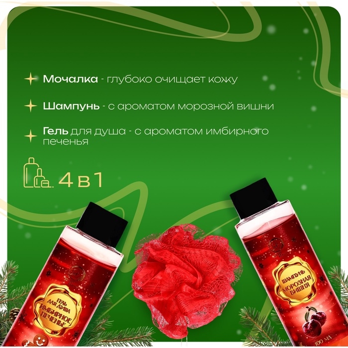 - Шампунь "Морозная вишня", 100 мл — он эффективно очищает волосы, придавая им блеск и жизненную силу. Нежный аромат остаётся на волосах, создавая лёгкое облако свежести, которое сопровождает вас весь день. Шампунь подходит для ежедневного использования и дарит ощущение легкости и чистоты.