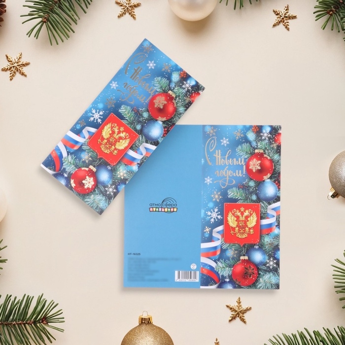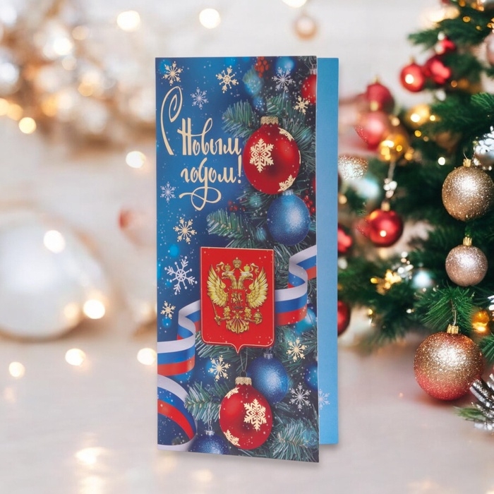 Открытка-евро "С Новым Годом!" тиснение, шарики, символика РФ, 19,5 х 10 см