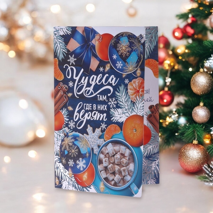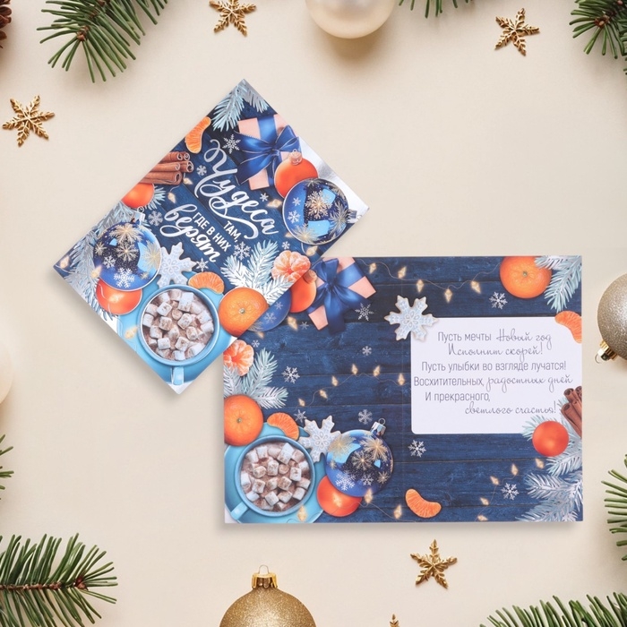 Открытка "Чудеса там, где в них верят!" тиснение, мандарины, 18 х 12 см