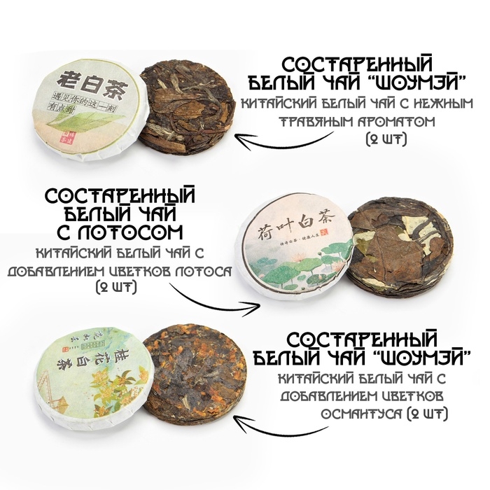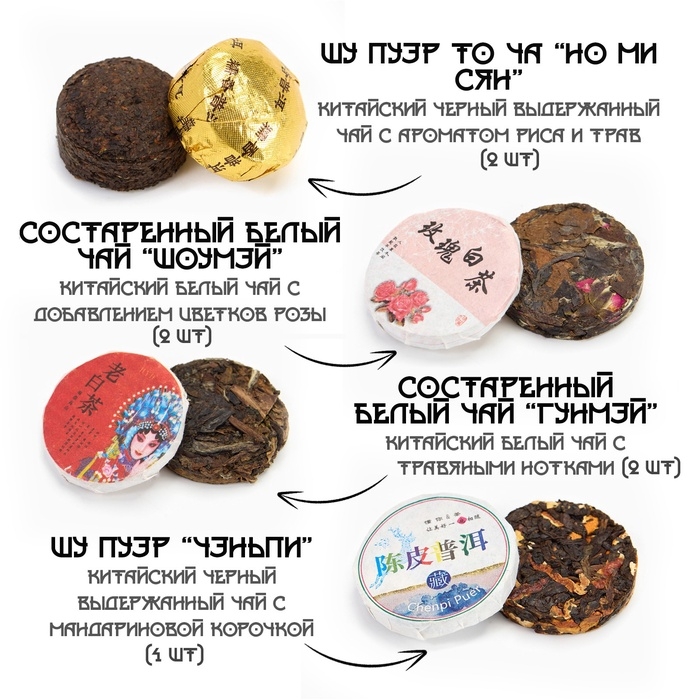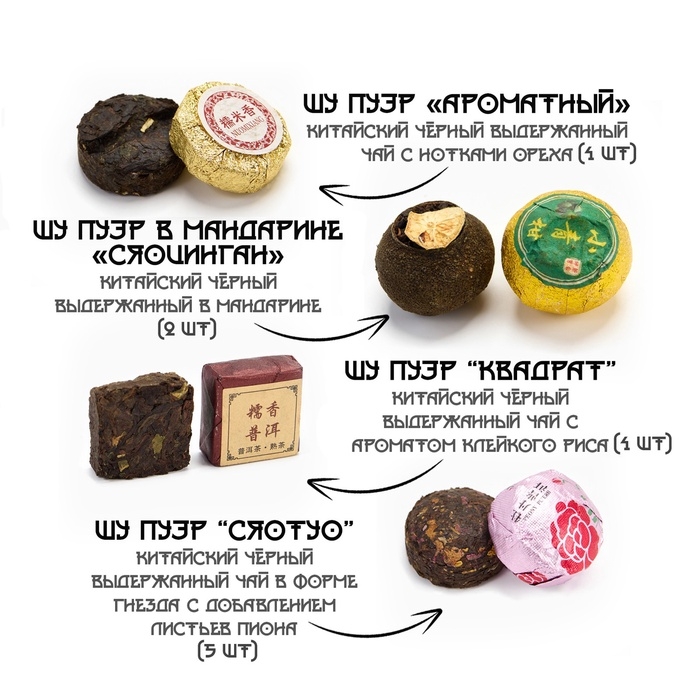 Ассорти китайского пуэра — это уникальный и изысканный чайный напиток, который сочетает в себе разнообразие вкусов и ароматов. Этот чай производится из листьев молодых чайных кустов, которые подвергаются специальной обработке и ферментации. В ассорти 2 вида китайского чая: Шу Пуэр и китайский белый чай.