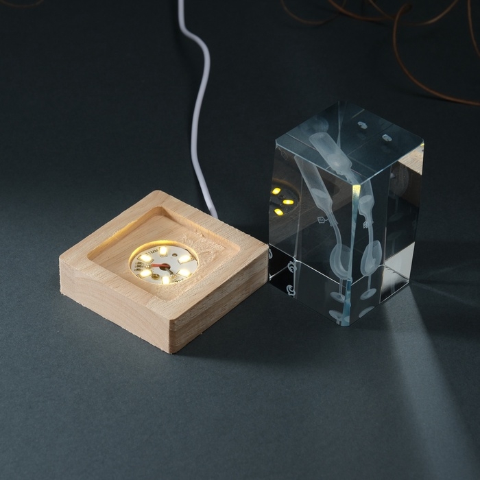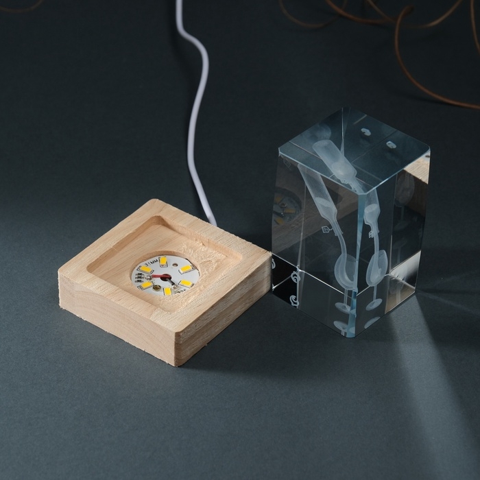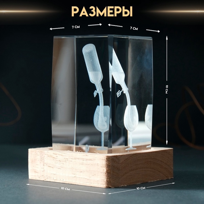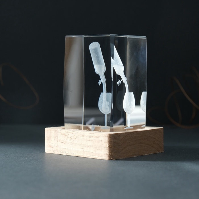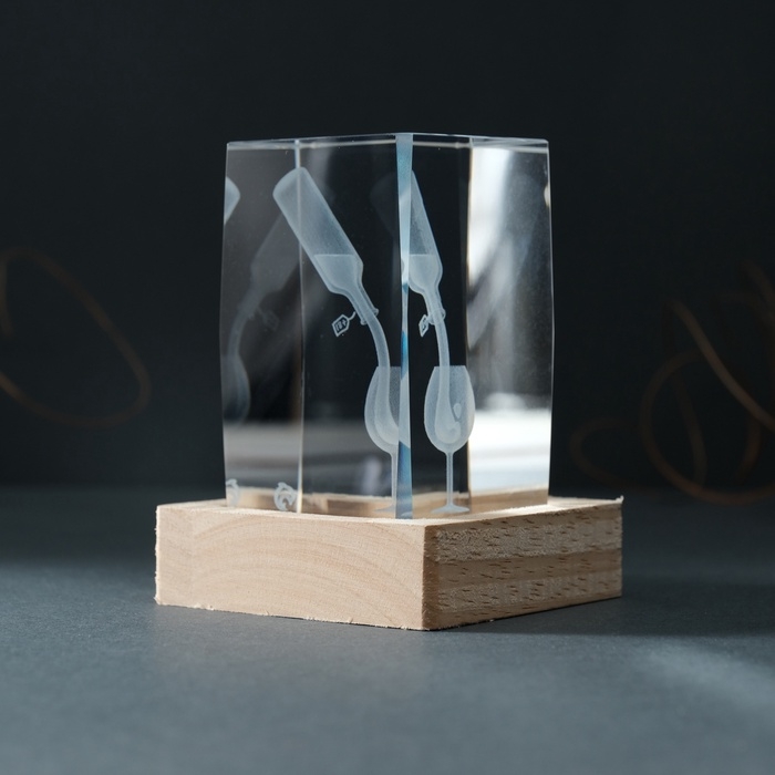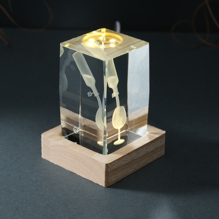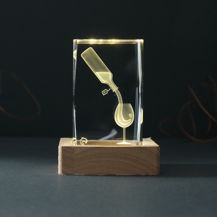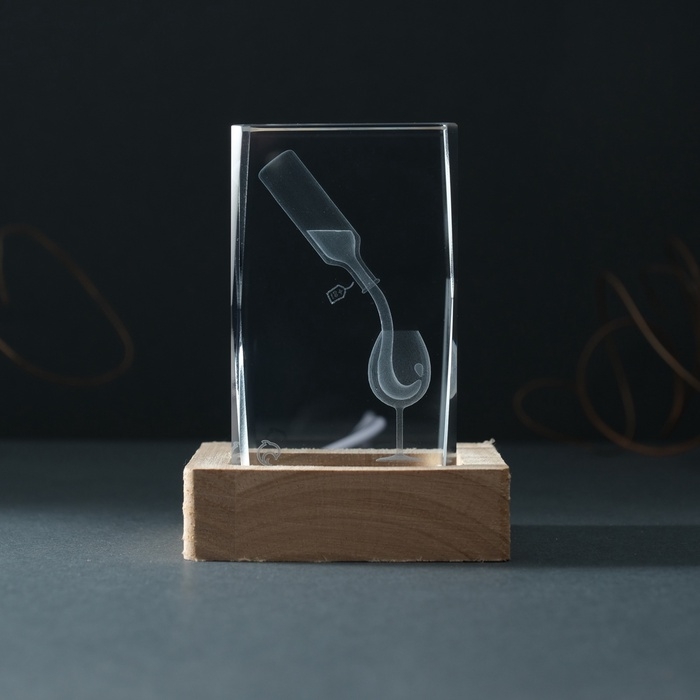 Сувенир стекло подсветка "Прямоугольник. Бокал и вино" подставка дерево, USB 7х7х10