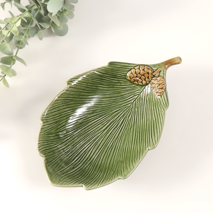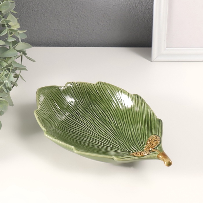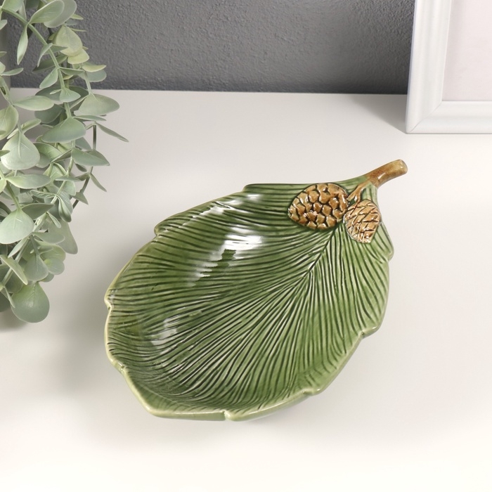 Сувенир керамика подставка "Лист с двумя шишками" зеленый 21,7х13,5х4 см