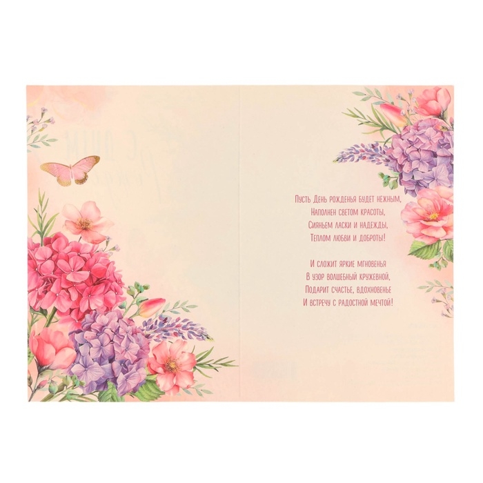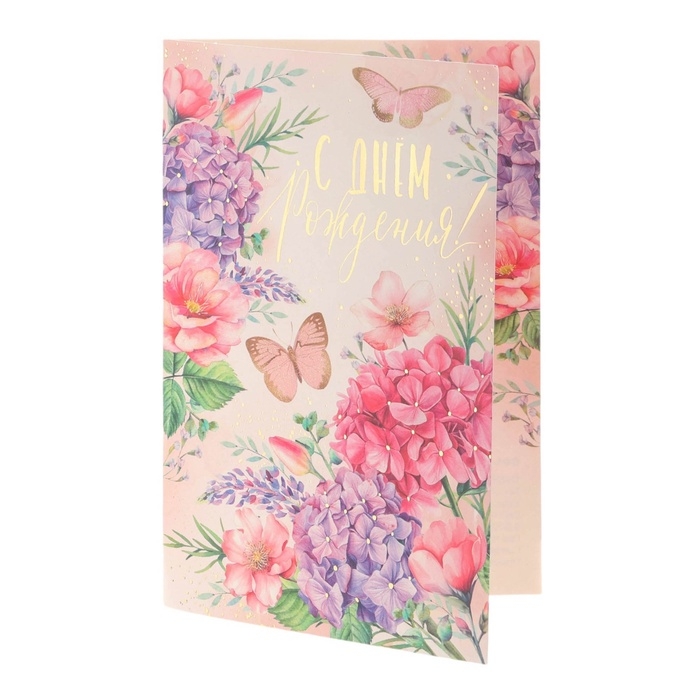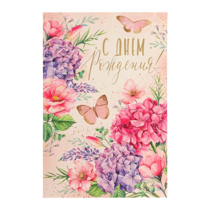 Открытка "С Днём Рождения!" тиснение, бабочки, гортензии, 12 х 18 см
