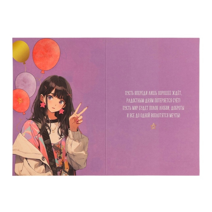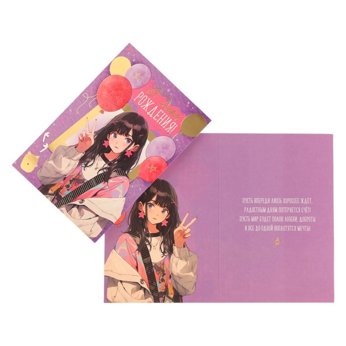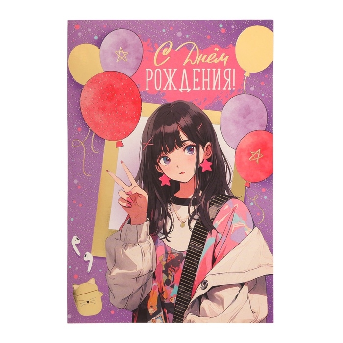 Открытка "С Днём Рождения!" тиснение, аниме, шарики, 12 х 18 см