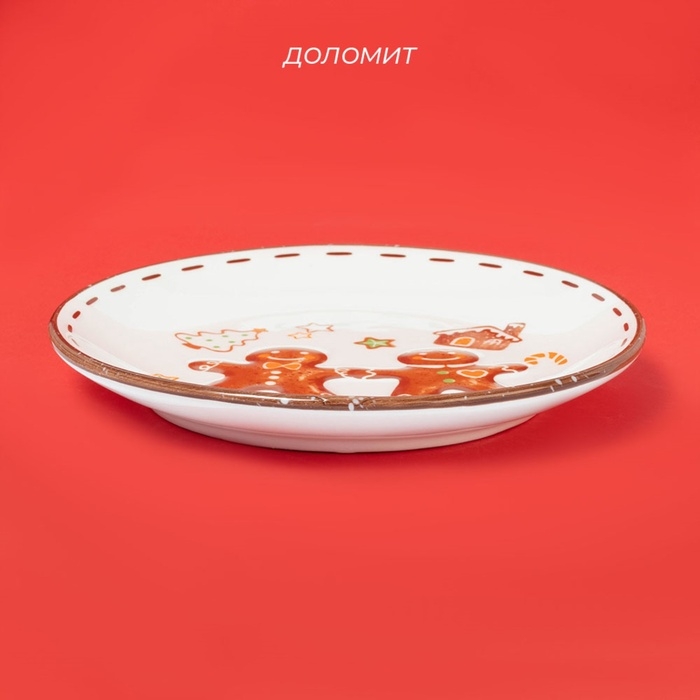 Тарелка выполнена из прочной керамики (доломита), что делает ее долговечной и устойчивой к повреждениям. Белый цвет и яркий рисунок с веселыми имбирными человечками создают праздничный контраст.