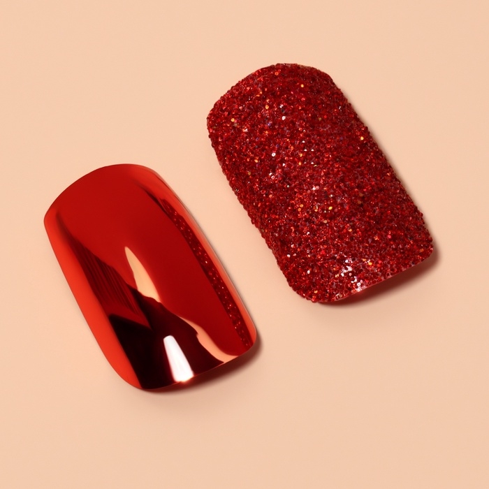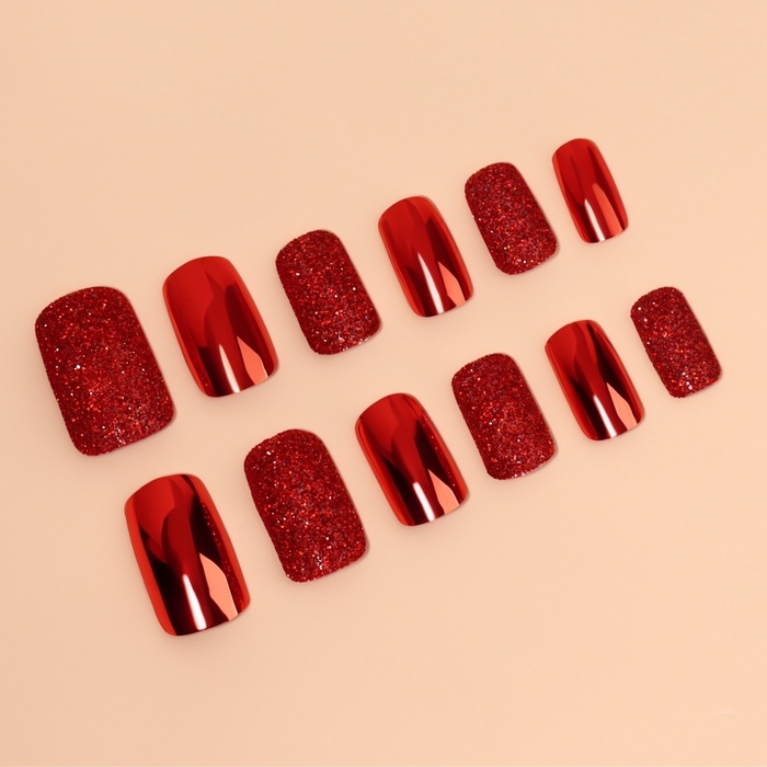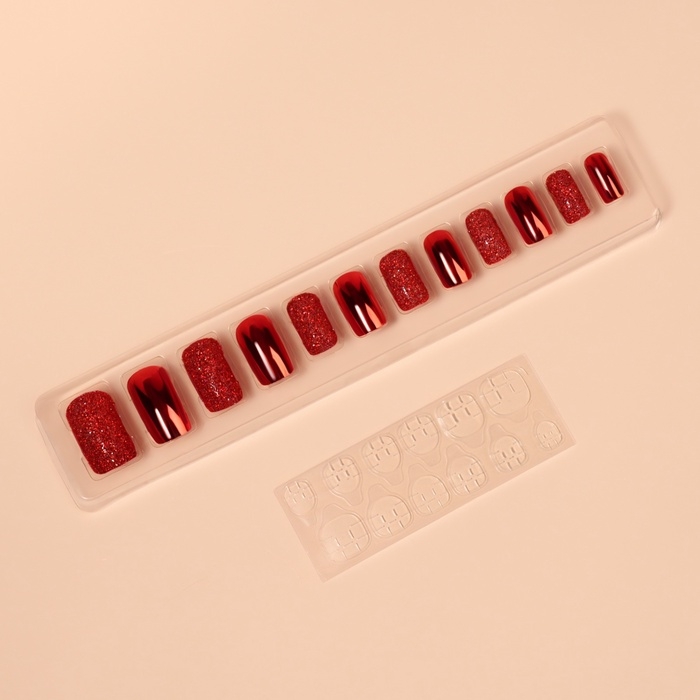 Накладные ногти, 12 шт, с клеевыми пластинами, форма мягкий квадрат, с блёстками, красные