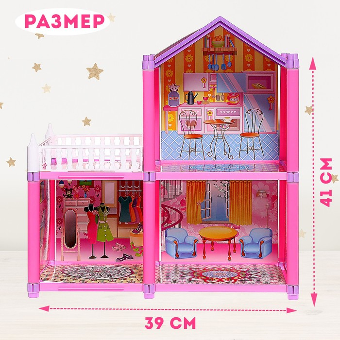 Размер домика в собранном виде: 39 × 18 × 41 см. Подходит для кукол высотой до 14 см. Мебель входит в комплект.