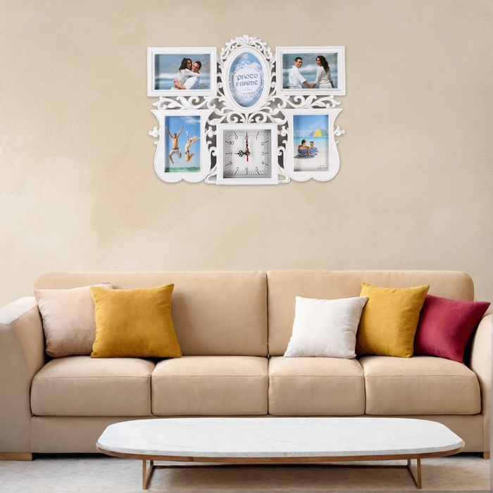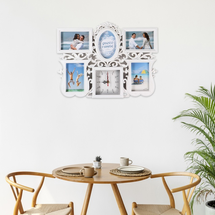 Фоторамка часы выполнена из качественного пластика, что обеспечивает устойчивость к механическим повреждениям. Благодаря оригинальному дизайну и гармоничному объединению рамок между собой, коллаж станет стильным дополнением вашего интерьера.