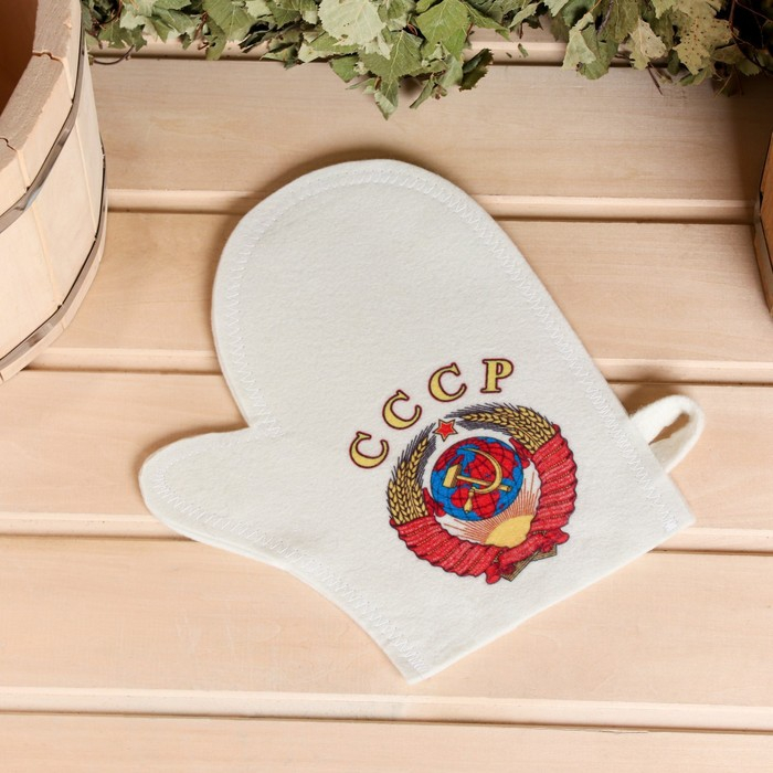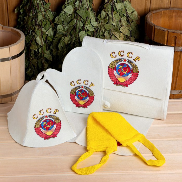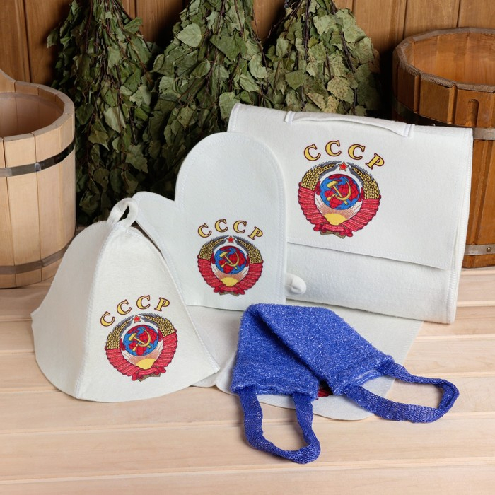 Набор для бани и сауны 5 в 1(сумка,шапка,варежка,коврик,мочалка),с принтом "СССР" , белый